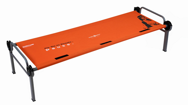 Aber vor allem in Extremsituationen, wie zum Beispiel bei Hochwasser, nach Erdbeben oder bei Pandemien hat sich das Disc-O-Bed bewährt. Dank seiner hohen Stabilität und seiner Flexibilität bietet es viele Einsatzmöglichkeiten. So kann man es zu Etagenbetten stapeln und noch mehr Menschen unterbringen, ohne an Komfort einbüßen zu müssen. Etagenbetten lassen sich zudem in Handumdrehen zu einer stabilen Sitzbank umfunktionieren. Ein weiteres Plus ist die Polyestermatte, die leicht abgenommen und gereinigt werden kann.
