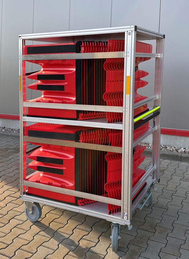 Der MUNK Rollcontainer mit einer kompakten Höhe unter 2 m fasst 48 gerade Elemente der Hochwasserbarriere PHÖNIX mit Stauhöhe 500 mm. Aufgebaut entspricht das einer Barriere mit einer Nettolänge von etwa 30 m. Optional kann die oberste Ebene des Rollcontainers für PHÖNIX Eckstücke (innen oder außen) oder Abschlusselemente genutzt werden. Ausschlaggebend für die Beladung „on top" ist die Laderaumhöhe des Fahrzeugs.
